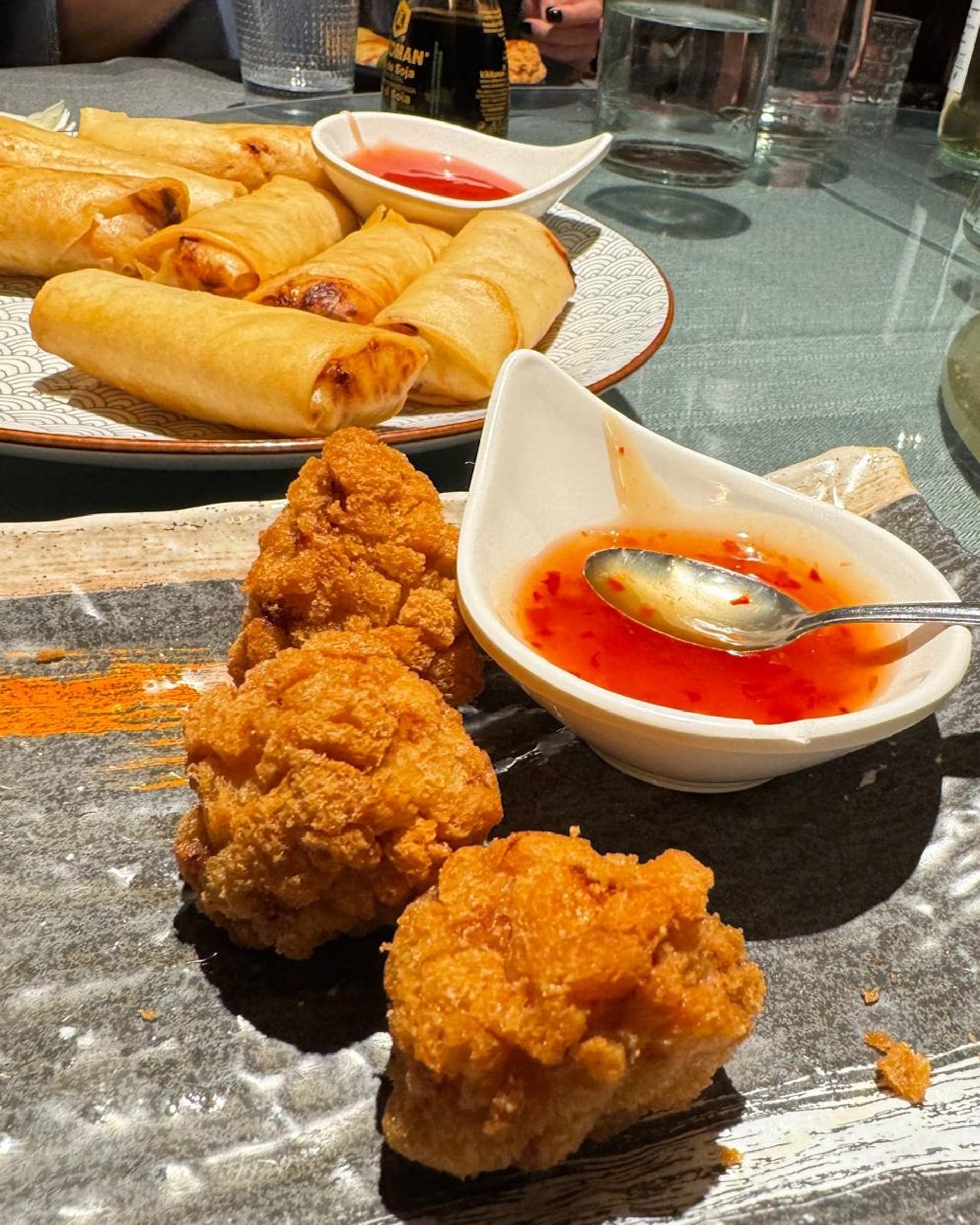 Menù: involtino primavera, crostino di gamberi, frittelle di verdure, ravioli di carne alla piastra, ravioli speciali all'acqua, ravioli di gamberi al vapore, riso speciale "Sam" con carne e uova, galletto croccante, pak choi, frutta fritta