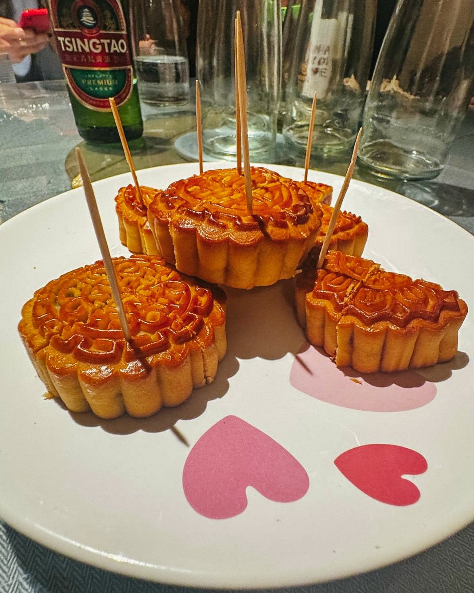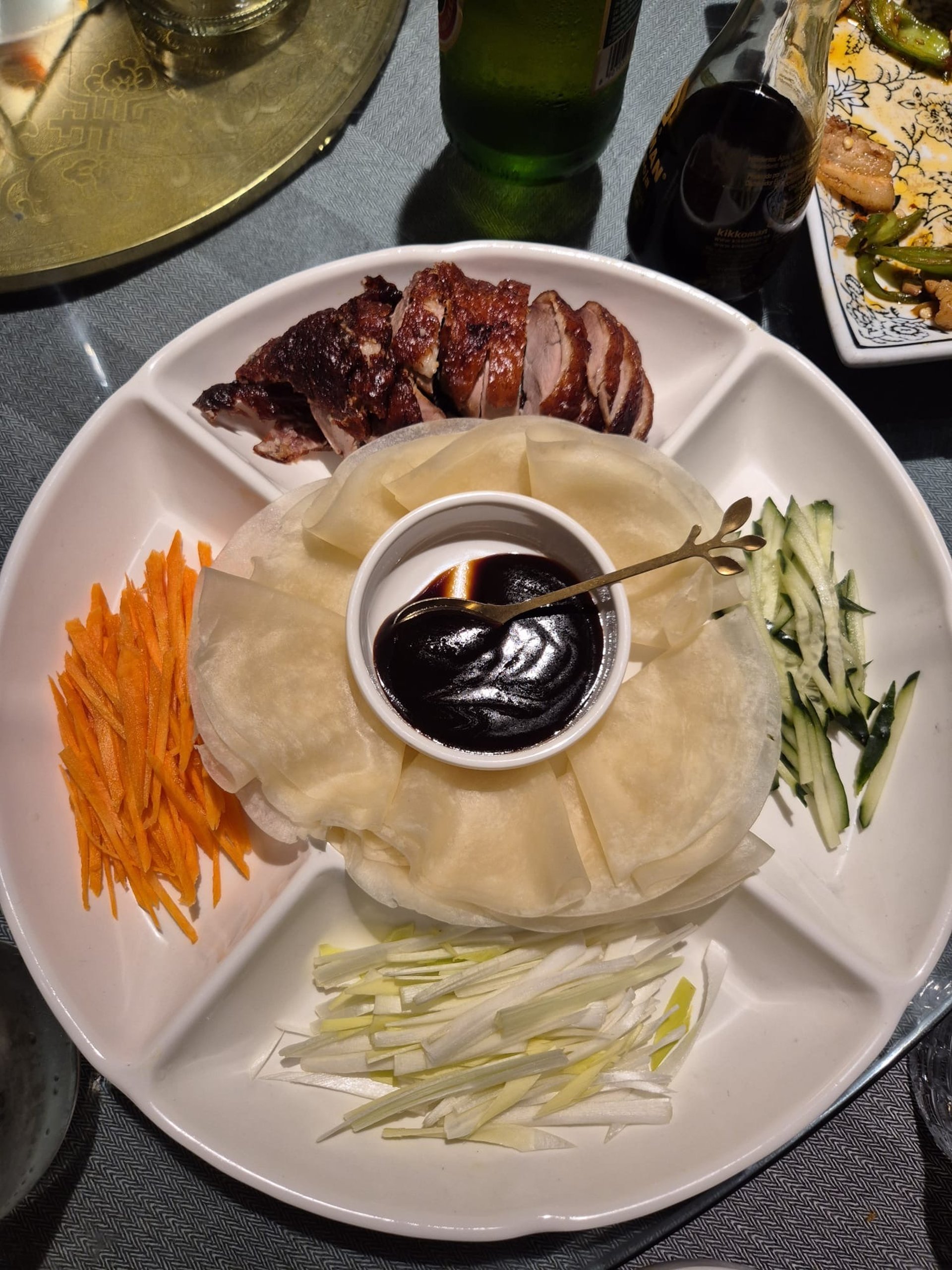 Menù: polpette di gamberi, involtini, ravioli di gamberi al vapore, xiao long bao, edamame, chaosaho, insalata di funghetti, cetrioli schiacciati, insalata di vitello con arachidi e coriandolo, riso croccante dorato, la mian saltati, spaghetti di riso stile Yunnan, rombo al vapore, capesante con spaghetti di soia ed erba cipollina, anatra alla pechinese, pollo infuicato, pancetta Sichuan, cavolo cinese, torta della luna, vino di prugne freddo