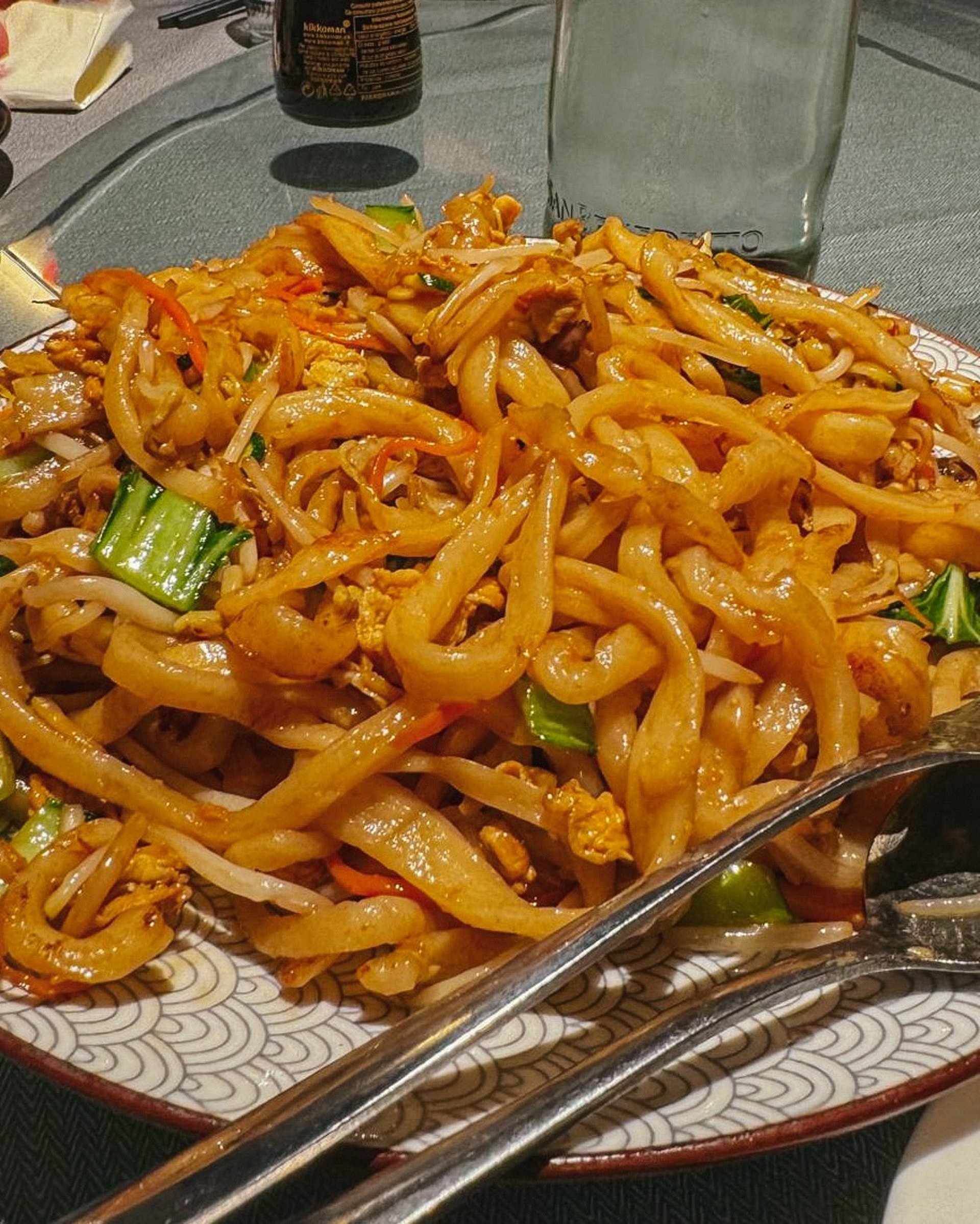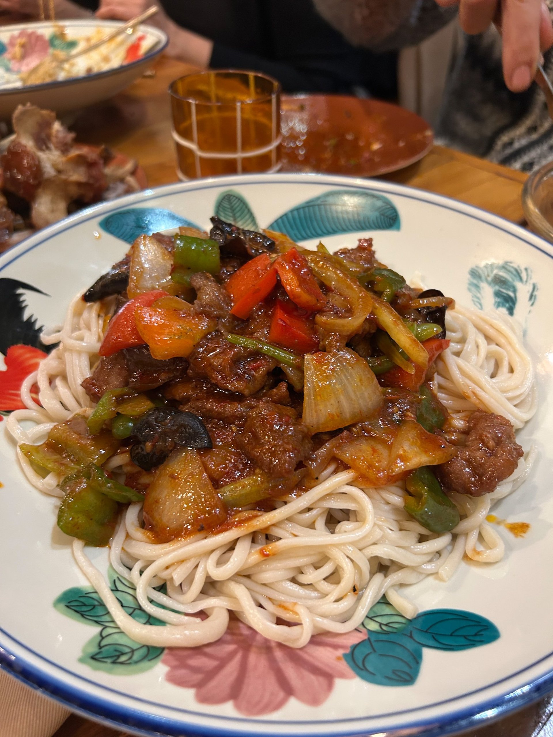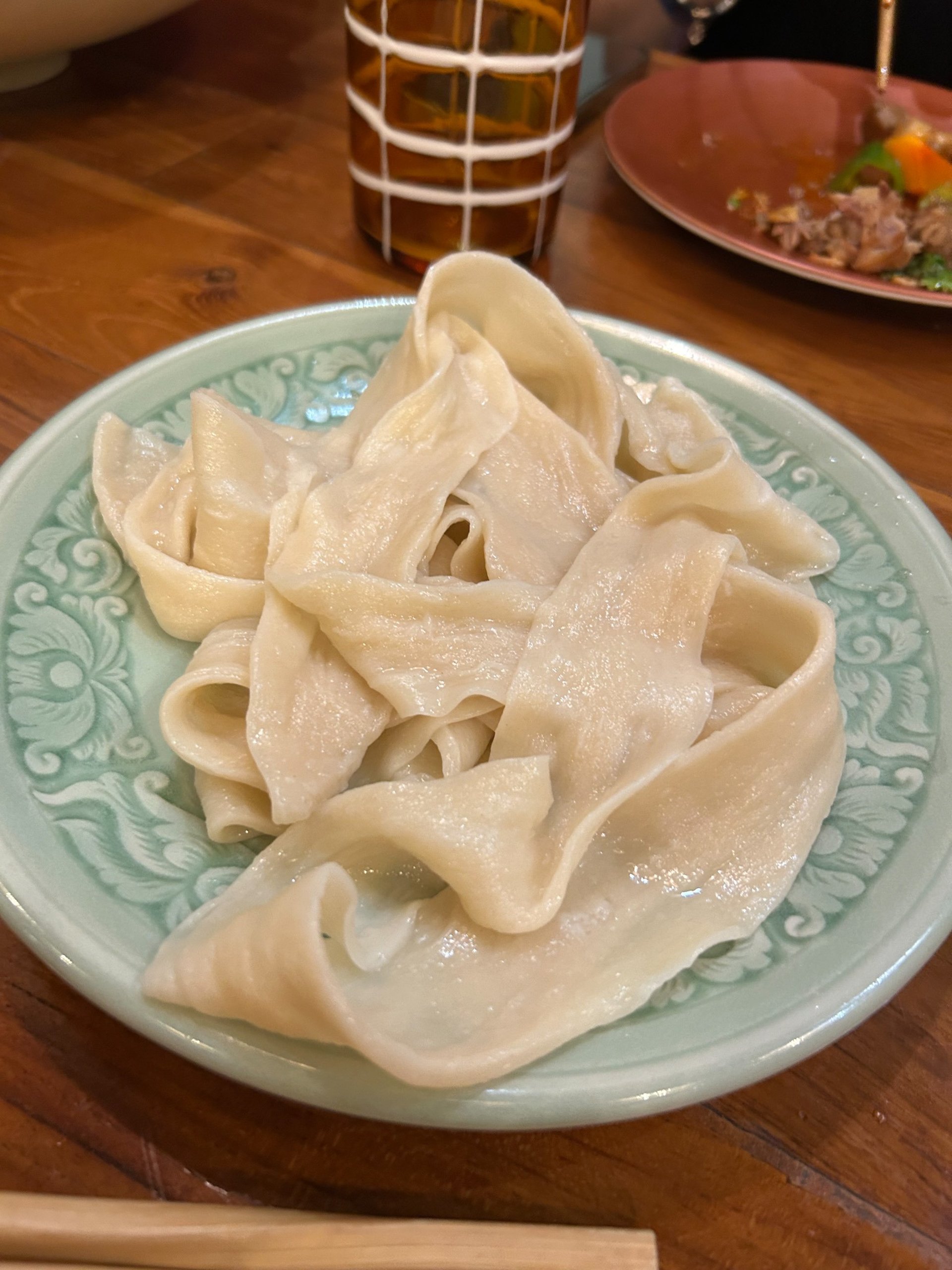 Menù: insalata di cetrioli, uovo centenario, patate lesse con salsa di sesamo, bao con maiale fritto, noodles "di Capodanno" con strisce di maiale salate con peperoncino, dolce di gnocchetti glutinosi