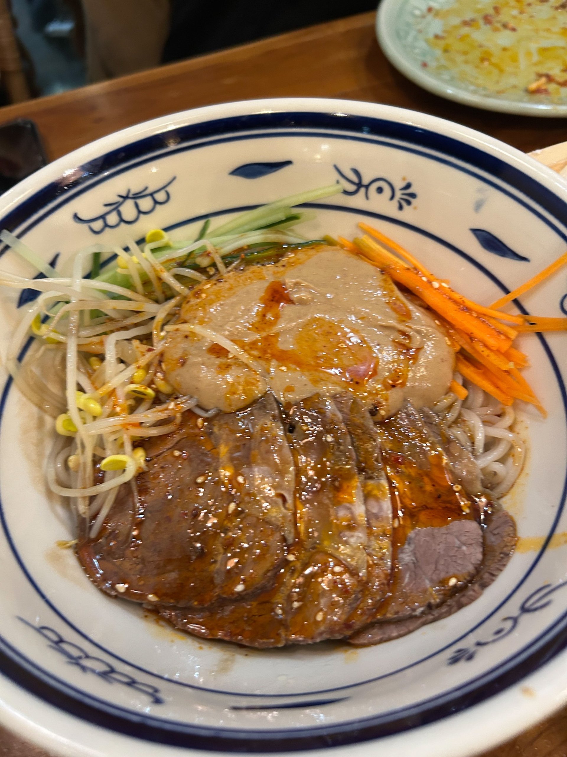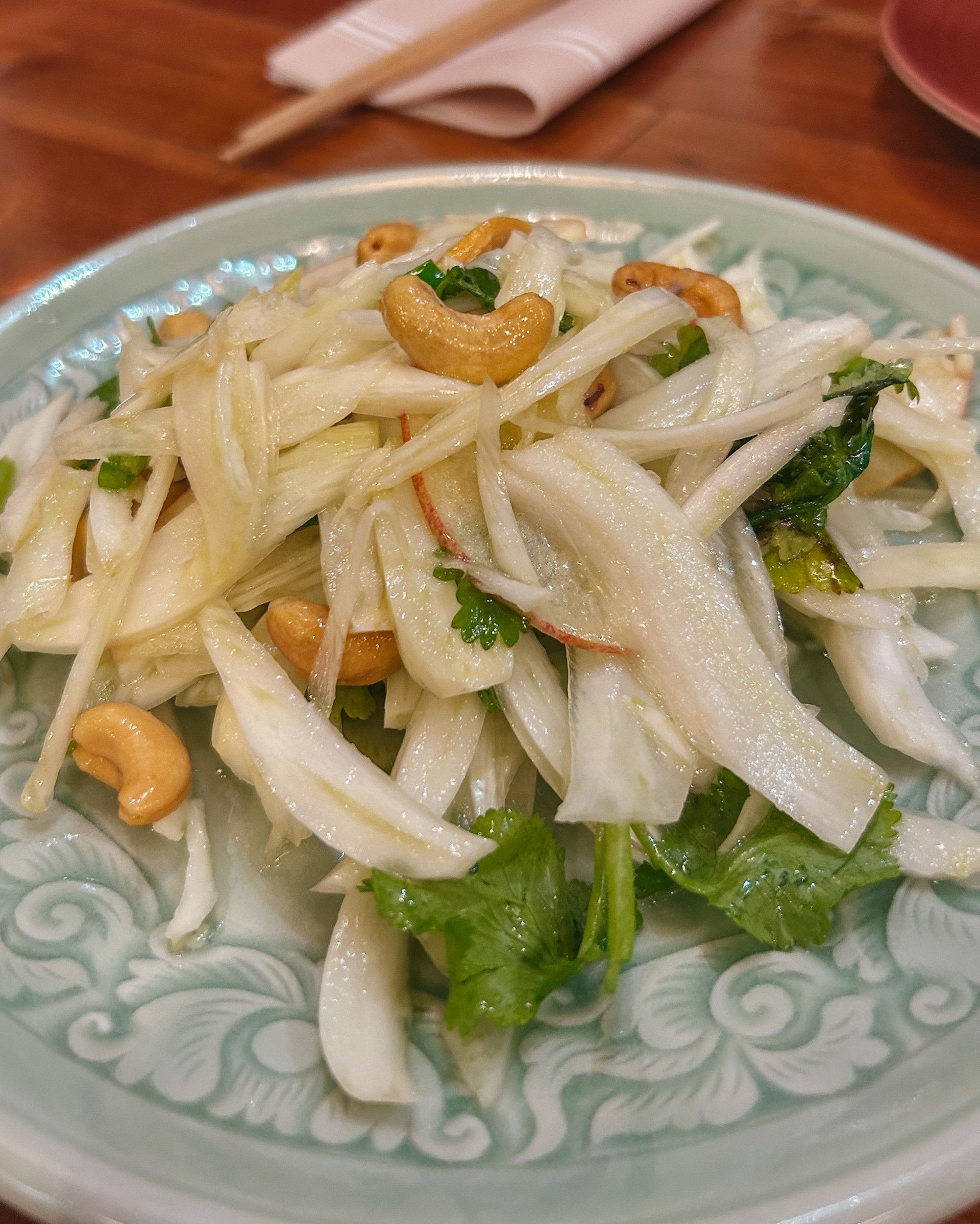 Menù: insalata di vitello con arachidi, pollo in salsa di arachidi, focaccia cinese fatta in casa, ravioli misti, riso croccante della casa, lamian tirati a mano saltati, scodella di fuoco con calamari, scodella di fuoco con pollo, manzo al cumino, fagiolini piccanti, verdure senza cuore, melanzane saltate