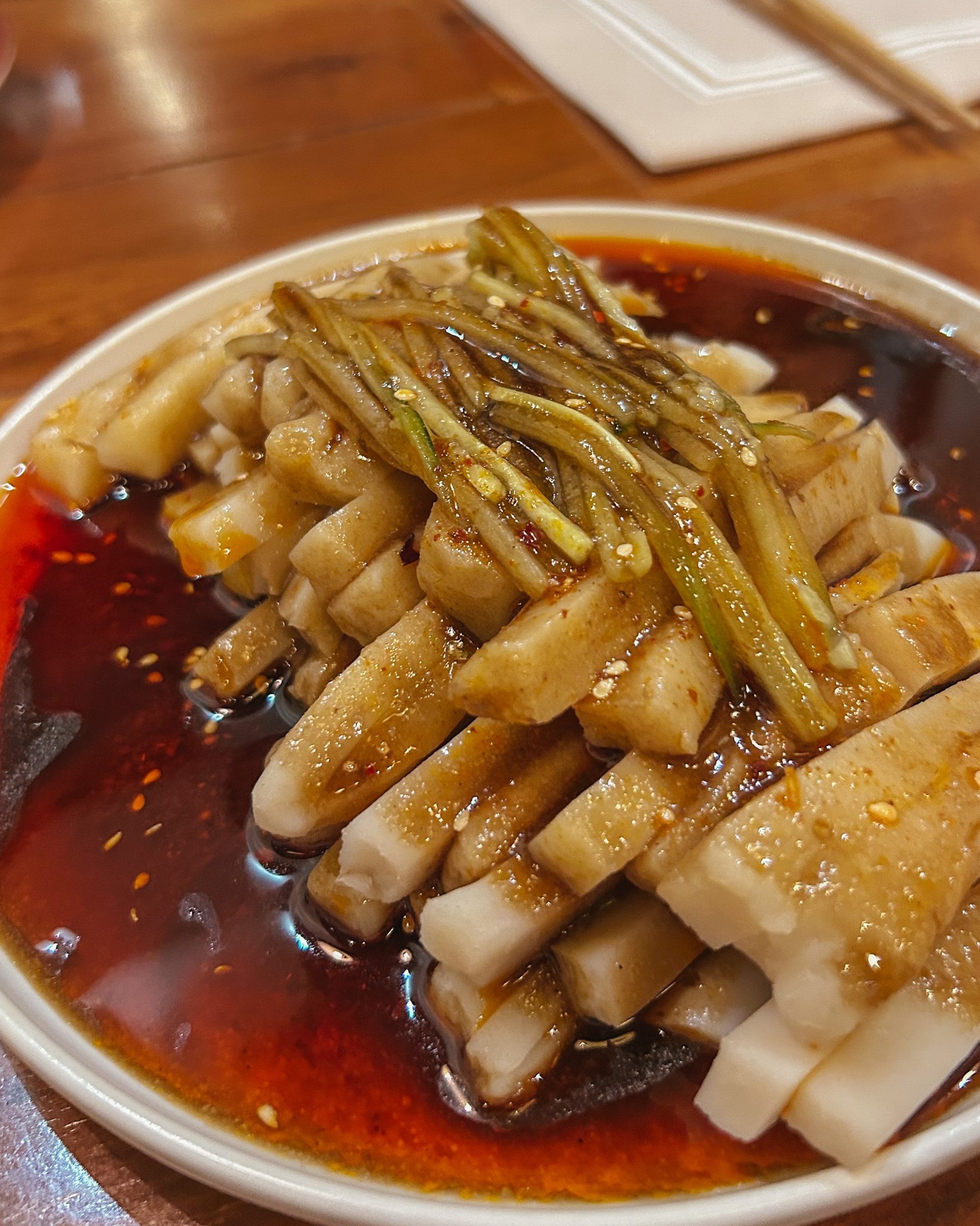 Menù: insalata di tofu caldo e hoe (sashimi di rombo frollato 48h), geiuk giapce bokkum (maiale in salsa piccante e gnocchi), tteok mandu guk (zuppa di gnocchi di riso e ravioli), banchan del giorno con kimchi, yak shik, Dalgona ppop kki