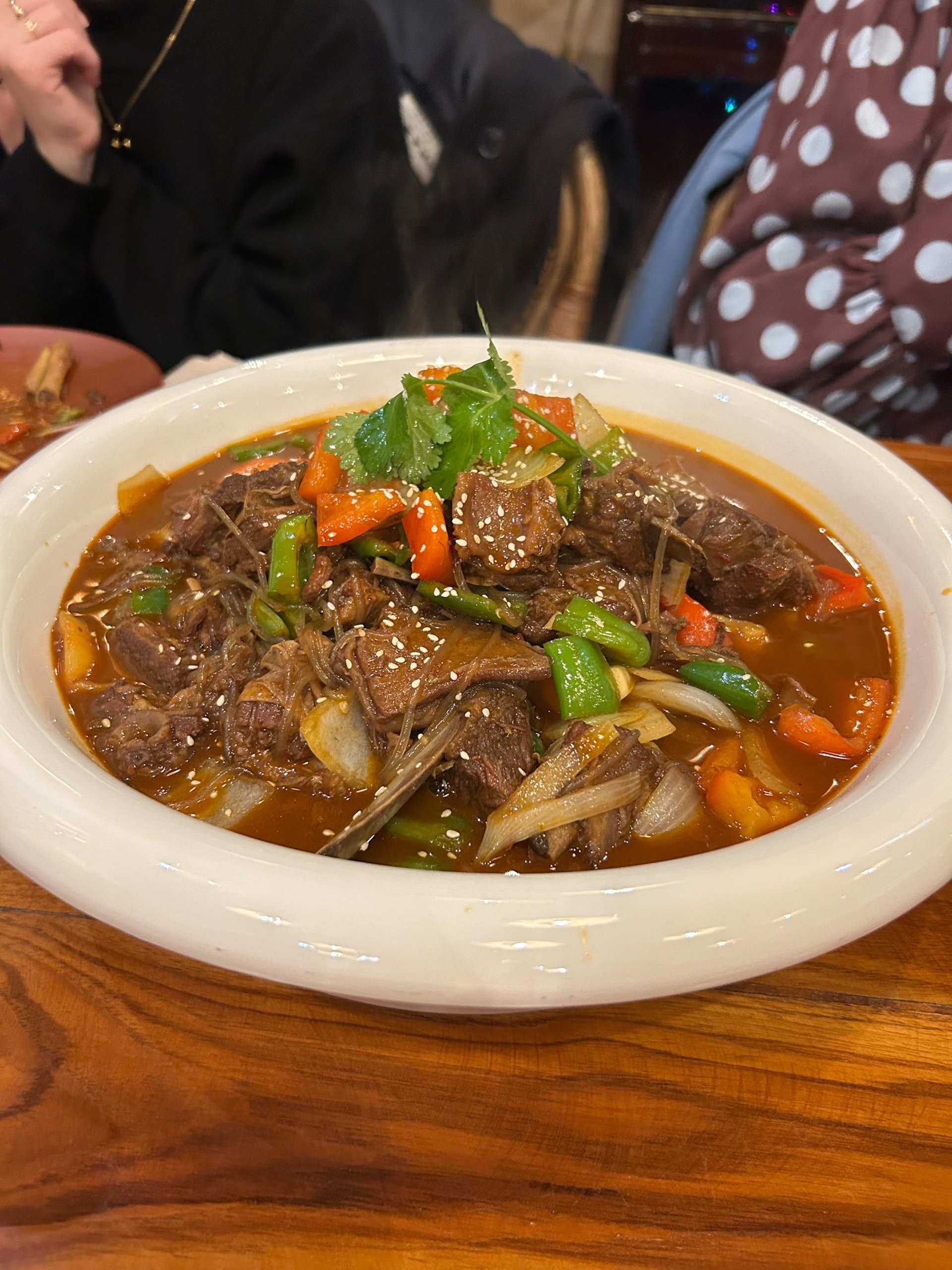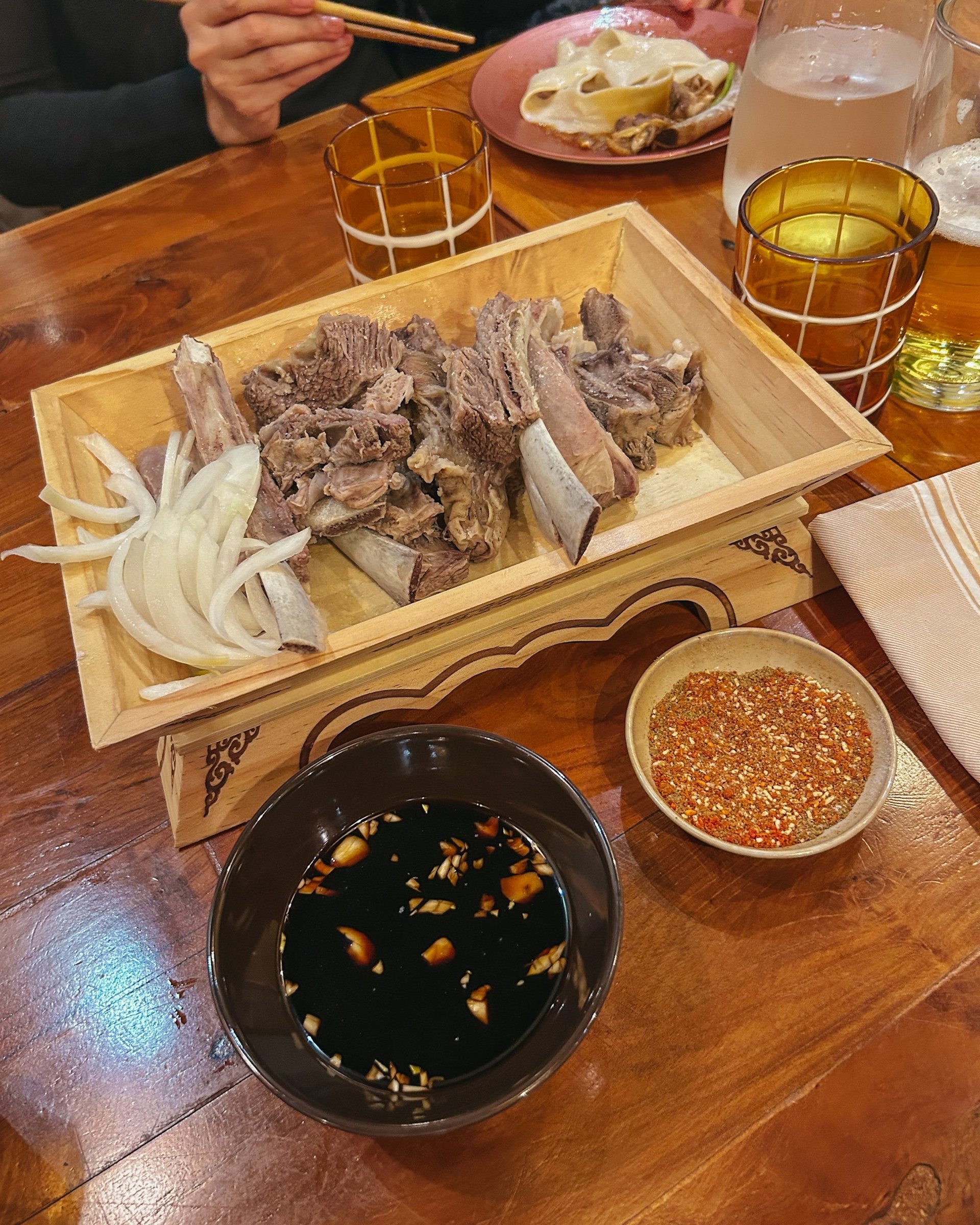 Menù: Lahuhu (patate, spaghetti di patate, tofu), gallina piccante dello Xinjiang, manzo freddo alla soia, liangpi, guoyourou (con manzo, verdure e funghi), tagliatelle all'aglio piccante, noodles saltati Ulan, saozimian dello Ningxia (con agnello, pomodoro e tofu), costine di agnello, agnello piccante dello Nigxia, costine di maiale alla prugna, pollo Xinjiang (con peperoni, patate e cipolla), coda di bue, cavolo saltato, stufato di carne dello Ningxia